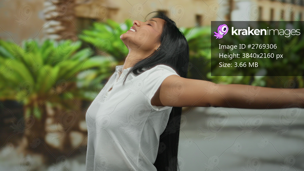 Young latina woman joyfully stretches her arms in a vibrant outdoor setting, exuding happiness and freedom on a sunny day amidst lush greenery and urban charm. - Kraken Images