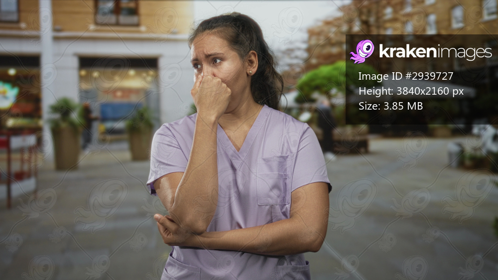 Young latina woman nurse pinching her nose and holding her arm while standing on a busy city street plaza with outdoor cafe and planters; disgust nausea. - Kraken Images