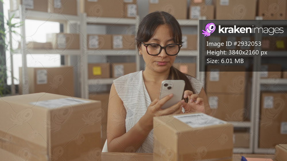 Young latina woman photographing shipping label with smartphone and holding package in building parcel office; small business focus.