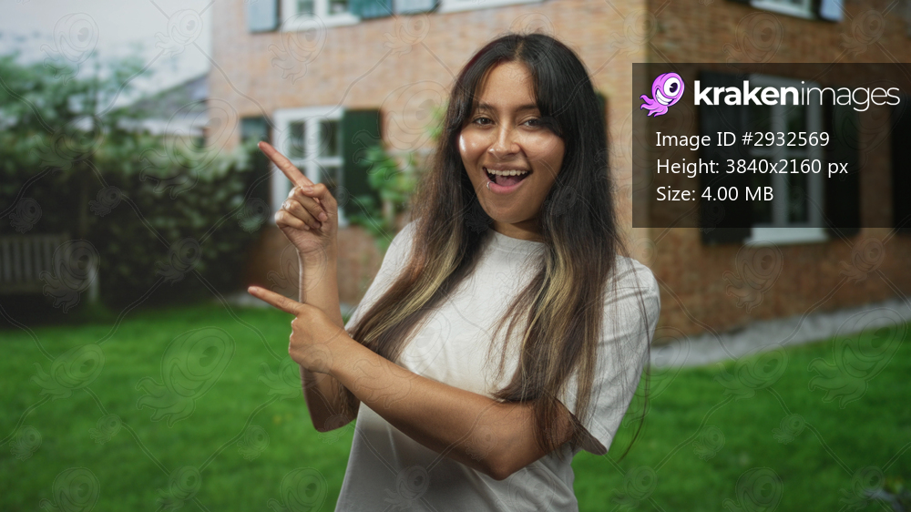 Young latina woman points both index fingers toward a brick house building entrance while smiling and standing outdoors; cheerful invitation.