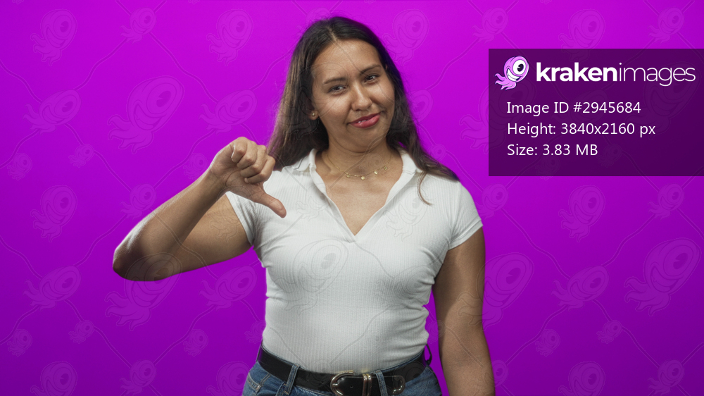 Young latina woman showing thumbs down with right hand and subtle smile in magenta studio; disapproval decline.