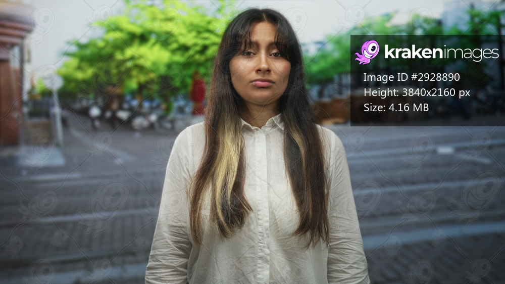 Young latina woman standing on street with pursed lips and visible lip ring, wearing white shirt and long hair; discontent urban solitude.