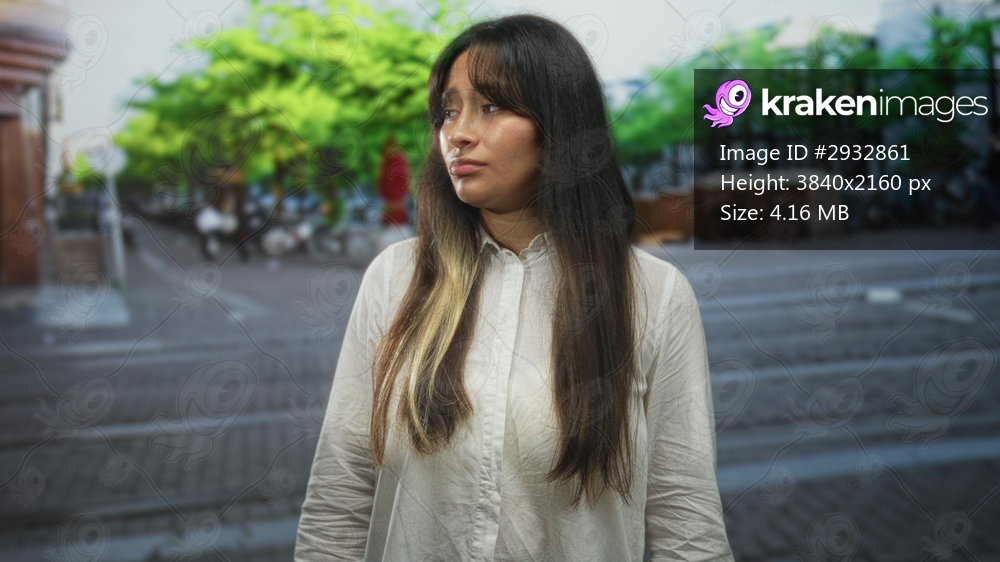 Young latina woman standing on street with pursed lips and visible lip ring, wearing white shirt and long hair; discontent urban solitude.