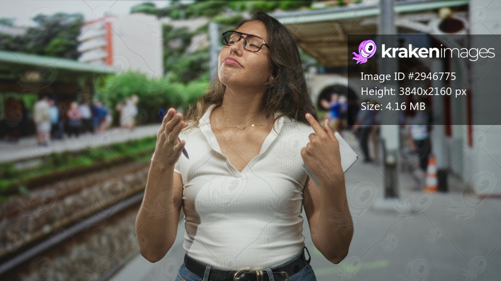 Young latina woman tugging at collar while holding a pen on a crowded train station platform, eyes closed and breathing heavily; tired commute.