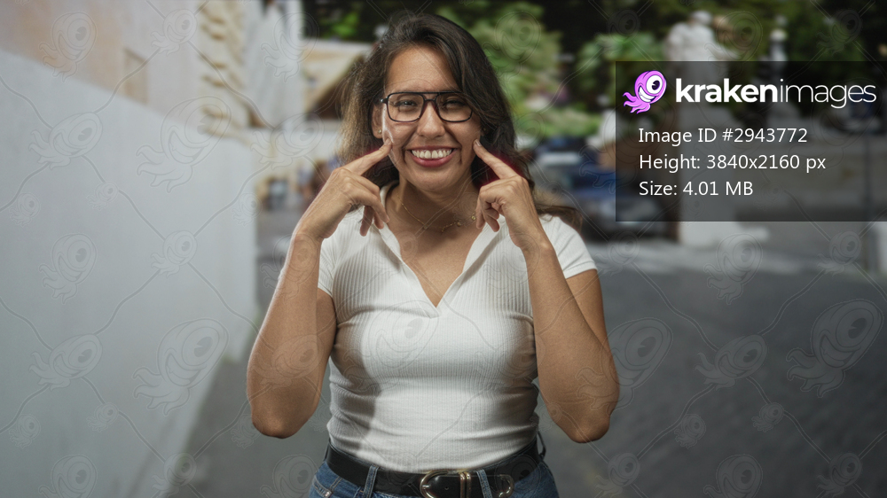 Young latina woman wearing glasses and a white shirt points fingers to cheeks and smiles on a sunny city street; joy.