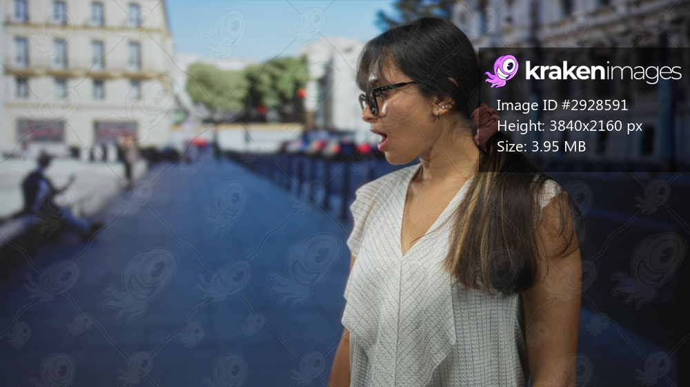 Young latina woman wearing glasses and a white sleeveless top turning head to the right in a city street with classical building facades; thoughtful confidence. - Kraken Images