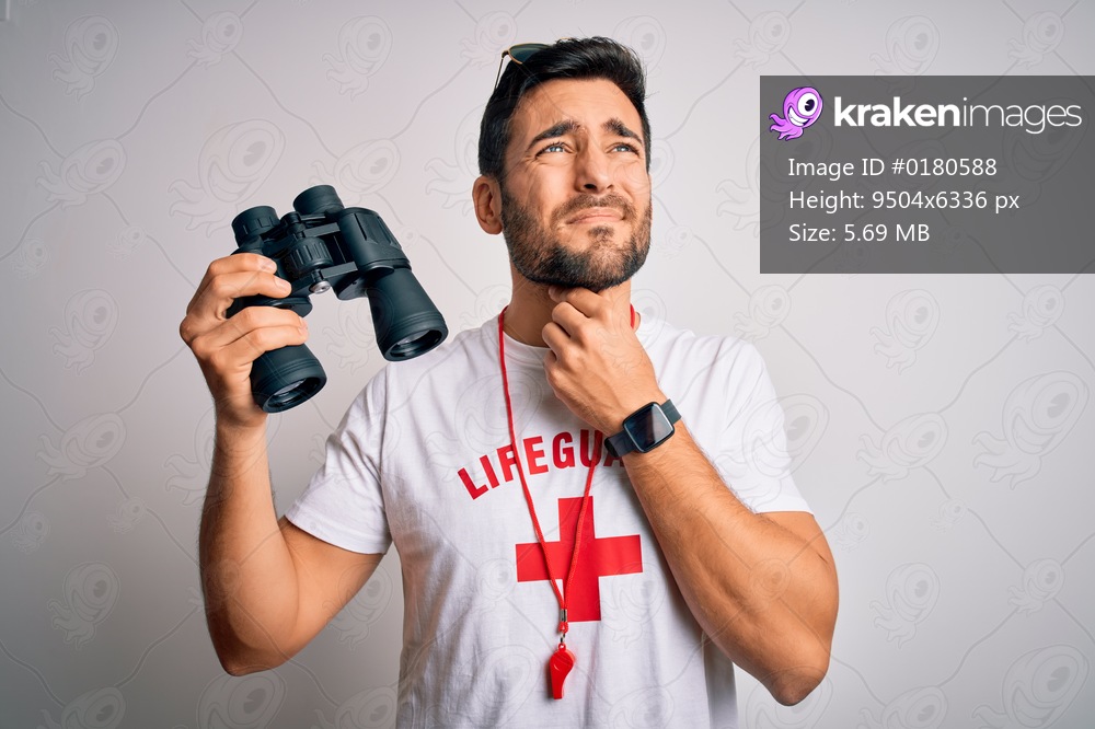 Young lifeguard man with beard wearing t-shirt with red cross and sunglasses using whistle Touching painful neck, sore throat for flu, clod and infection - Kraken Images