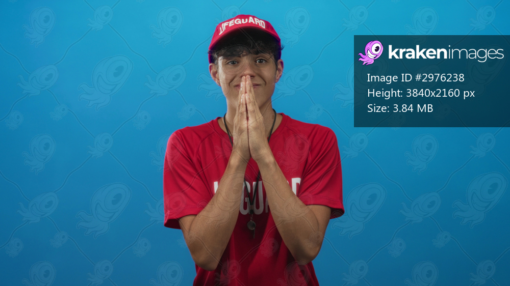 Young lifeguard man in red shirt and cap with hands clasped near mouth pleading gesture in studio, wearing whistle on lanyard and tense smile against blue backdrop; anxiety duty. - Kraken Images