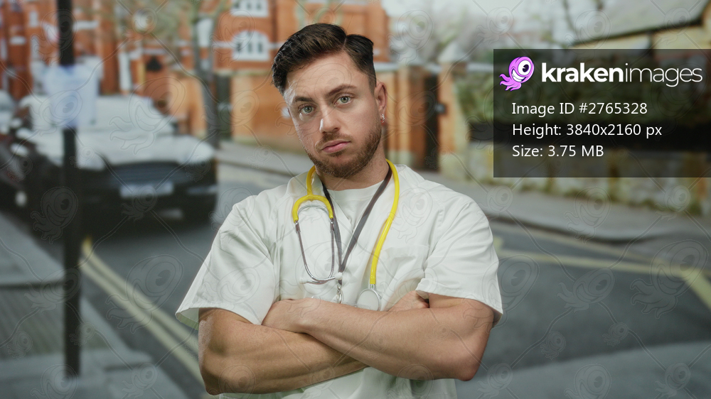 Young male doctor with a beard and stethoscope standing with crossed arms on a city street, conveying a professional serious demeanor outdoors.