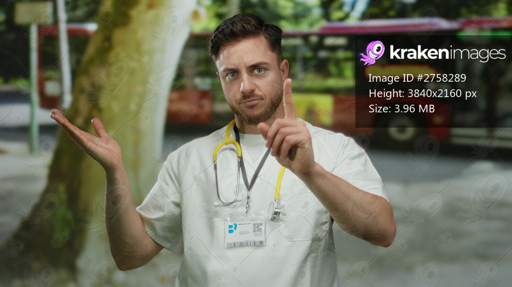 Young male doctor with beard in white coat and stethoscope gestures no with finger on city street