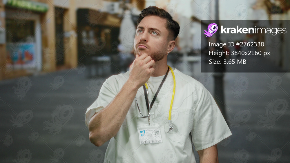 Young male doctor with beard and stethoscope stands thoughtfully on a city street, capturing professionalism and contemplation in an urban setting.