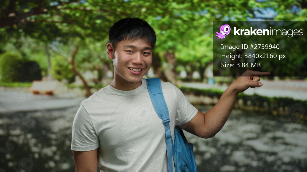 Young man with a backpack pointing and smiling outdoors in a lush green park, showcasing a vibrant and cheerful atmosphere of leisure and exploration.