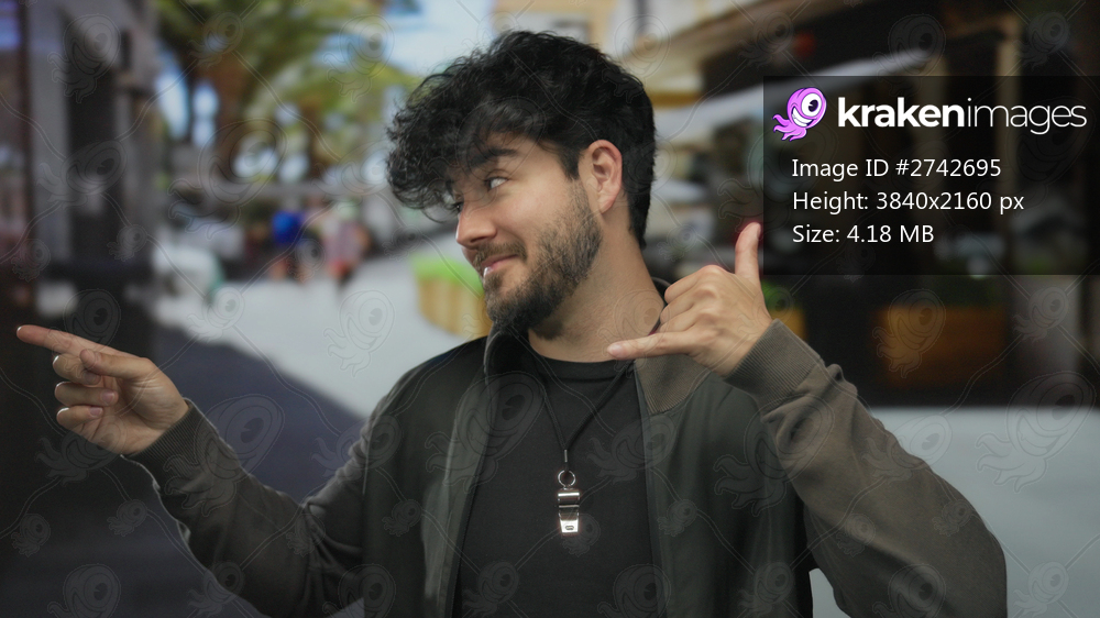 Young man with a beard gestures a phone call while standing outdoors on a busy street, smiling confidently in a relaxed urban setting.