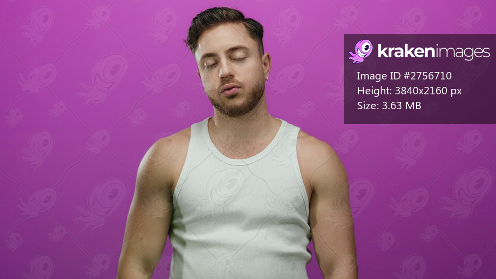 Young man with a beard gesturing with his fingers against a vibrant pink background, wearing a white tank top and expressing emotion with closed eyes, creating a dramatic scene. - Kraken Images