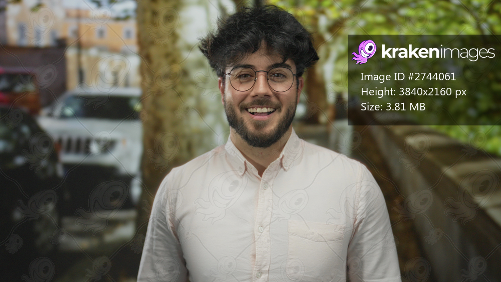 Young man with a beard and glasses smiling on a sunny street with cars and trees lining the background.