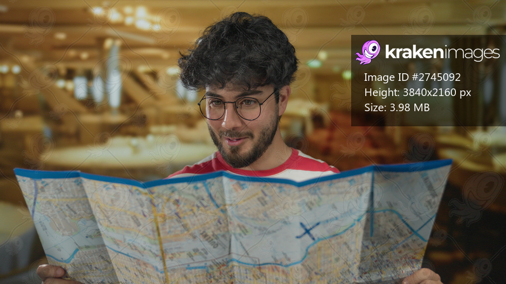 Young man with a beard and glasses studies a map inside a cozy restaurant, suggesting travel planning and exploration in an indoor setting.