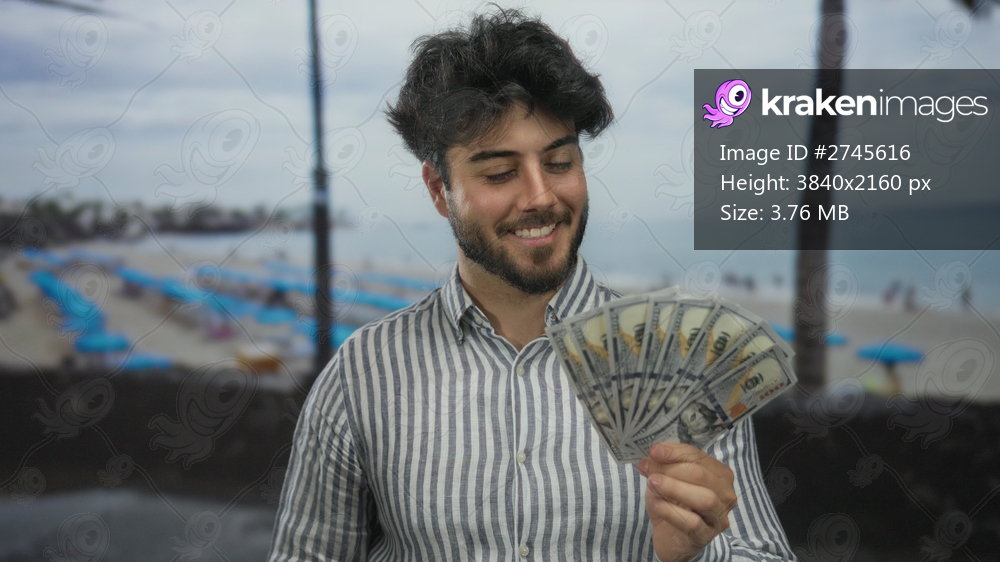 Young man with a beard holding us dollars, smiling at the seaside, with umbrellas on a beach, showcasing happiness and financial success in an outdoor coastal environment. - Kraken Images