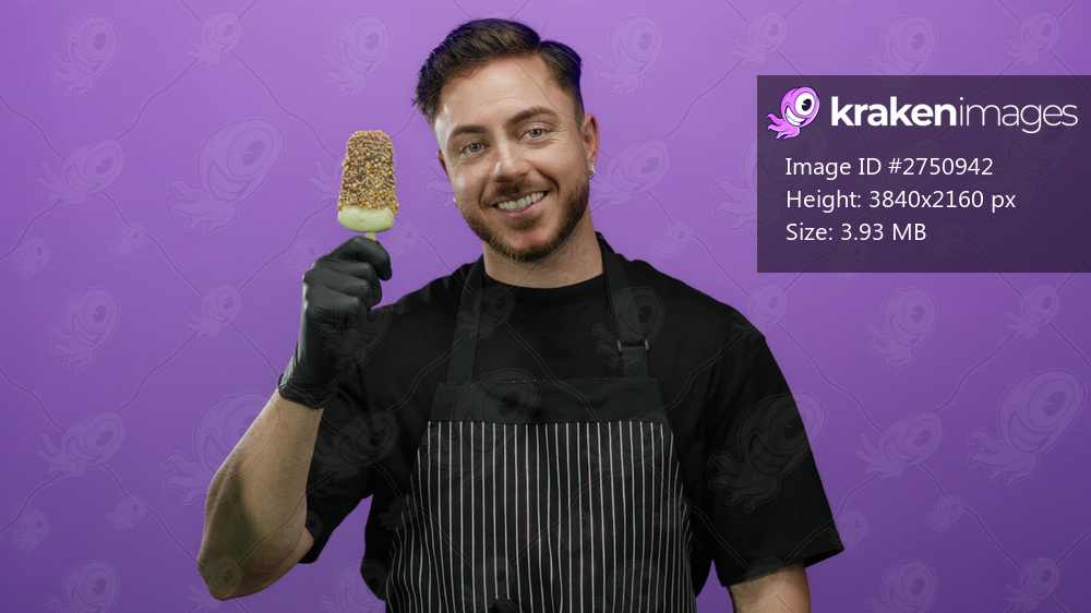 Young man with a beard in a black apron holds ice cream on a stick against an isolated purple background, smiling warmly.