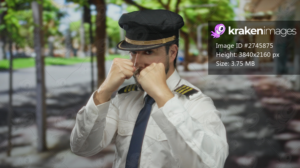 Young man with a beard in a pilot uniform playfully posing with fists outdoors on a sunlit street surrounded by green trees, showcasing an energetic and playful atmosphere. - Kraken Images
