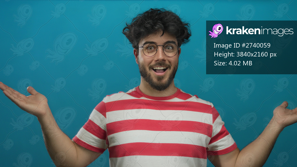 Young man with a beard in a striped shirt surprises himself by removing his hands from his eyes against a vibrant blue background.
