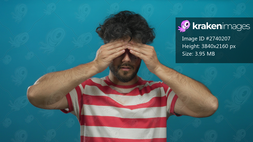 Young man with a beard in a striped shirt surprises himself by removing his hands from his eyes against a vibrant blue background.