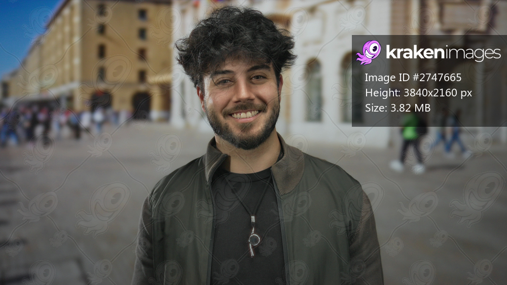 Young man with a beard smiling confidently outdoors on a busy street with historic buildings and people walking in the background, showcasing urban lifestyle and culture. - Kraken Images