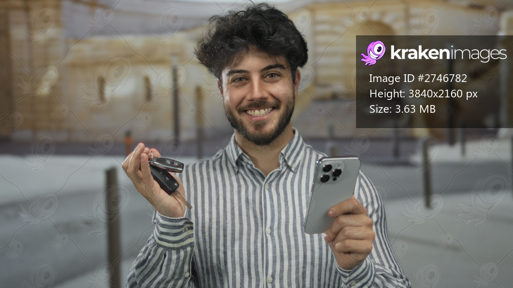 Young man with a beard smiling and holding keys and a phone outdoors on a street, showcasing modern technology and urban lifestyle in a vibrant city atmosphere. - Kraken Images