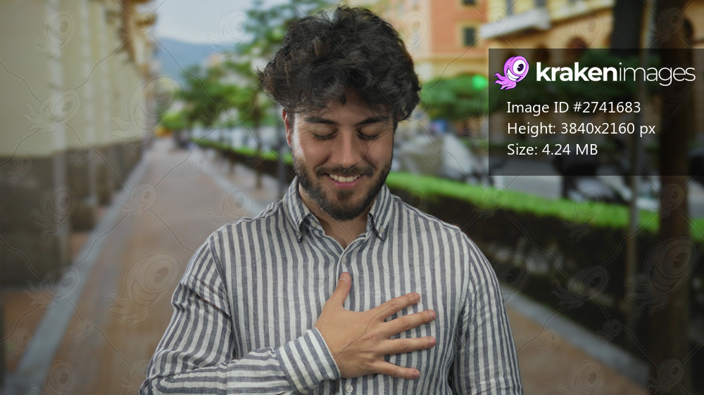 Young man with a beard standing outdoors on a street, wearing a striped shirt, smiling with a hand over his heart, surrounded by blurred greenery and buildings under a clear sky. - Kraken Images