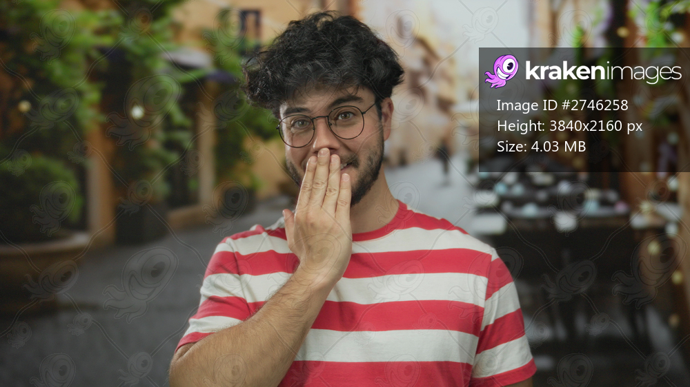 Young man with a beard wearing glasses and a striped shirt covers his mouth outdoors on a vibrant street with greenery and restaurants, suggesting surprise or amusement. - Kraken Images
