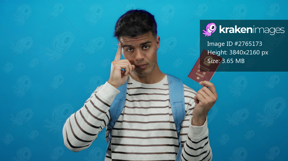 Young man with a blue background holding a chinese passport touches his head in thought, wearing a striped shirt and a blue backpack, implying travel and identification theme. - Kraken Images