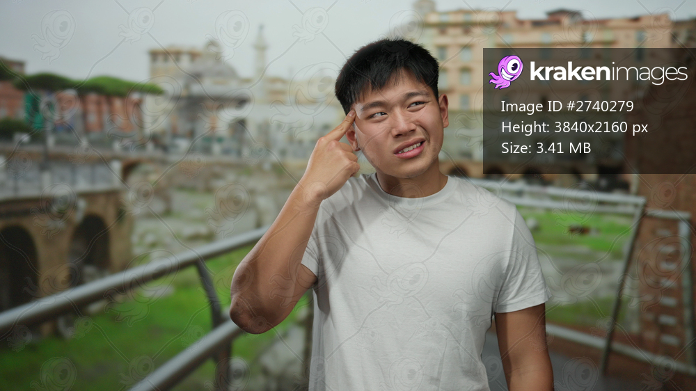 Young man with a confused gesture stands on a bustling city street, surrounded by urban architecture and greenery, expressing puzzlement outdoors.