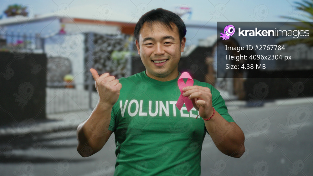 Young man with a pink ribbon and volunteer shirt gestures in an urban street supporting breast cancer awareness