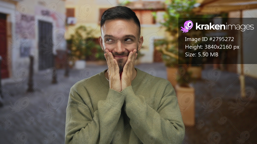 Young man with a playful expression stands in a charming urban street setting, surrounded by blurred buildings and greenery, capturing a spontaneous outdoor moment. - Kraken Images