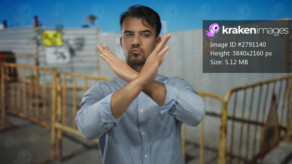 Young man with a serious expression making stop gestures at a construction site outdoors.