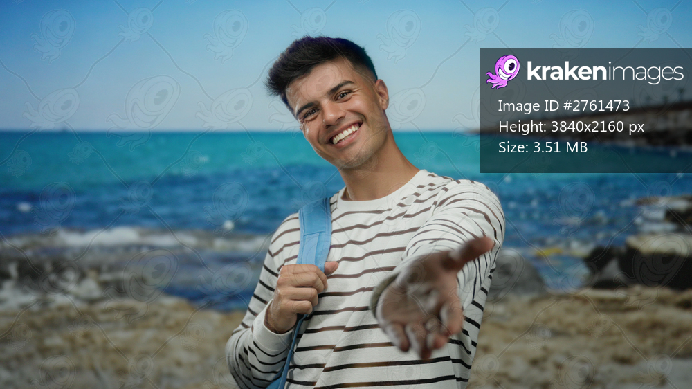 Young man with a striped shirt smiles warmly at the seaside, extending his hand towards the camera, with a turquoise sea in the background, capturing a friendly summer moment. - Kraken Images