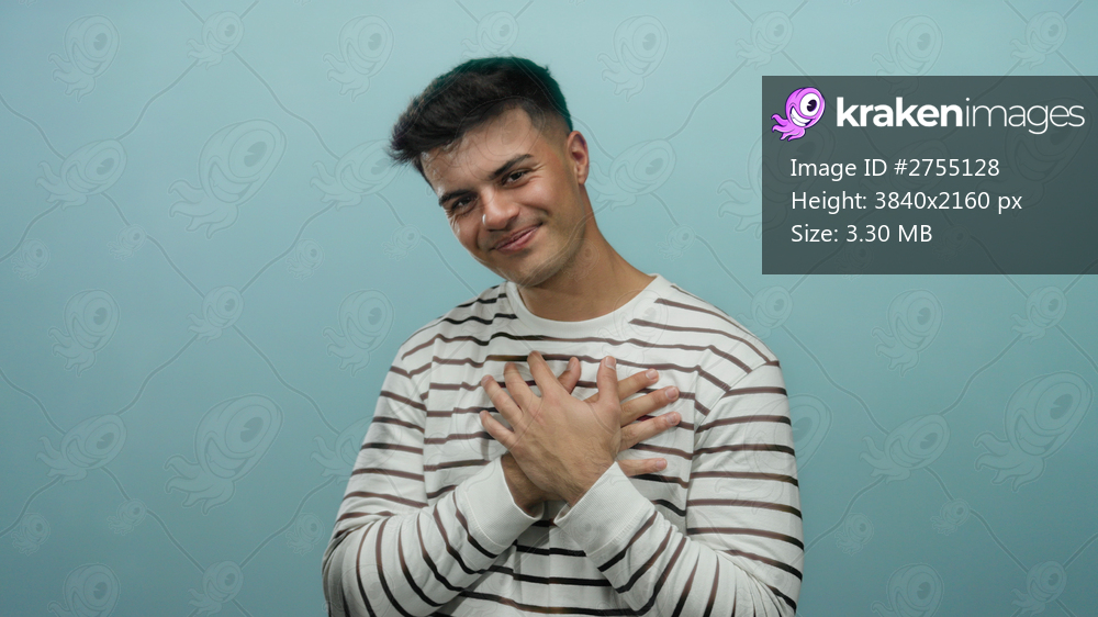 Young man with a striped shirt smiling gently with hands on chest against a solid blue background, conveying a heartfelt emotion with an isolated portrait look. - Kraken Images