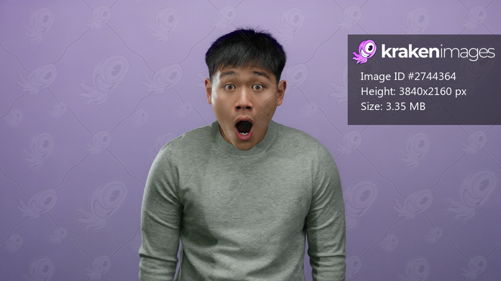 Young man with a surprised expression stands against an isolated purple background, wearing a gray shirt, encapsulating a moment of shock and emotion.