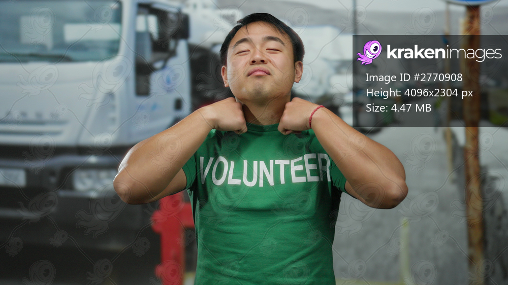 Young man adjusting green volunteer shirt on urban street with trucks in background, exuding pride and confidence in his voluntary work and community service. - Kraken Images