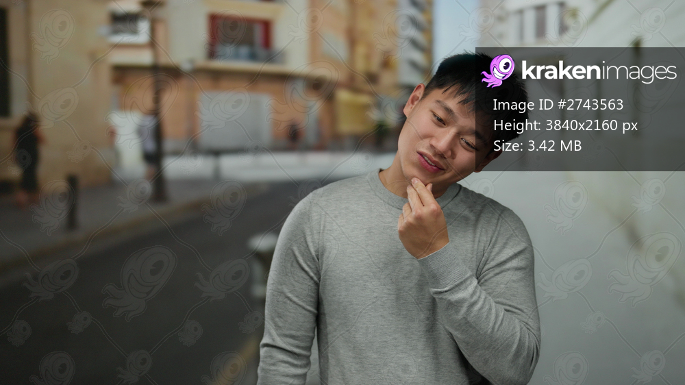 Young man with an idea gesture standing on urban street, expressing creativity and positivity in outdoor city environment, showcasing casual attire and a joyful mood. - Kraken Images