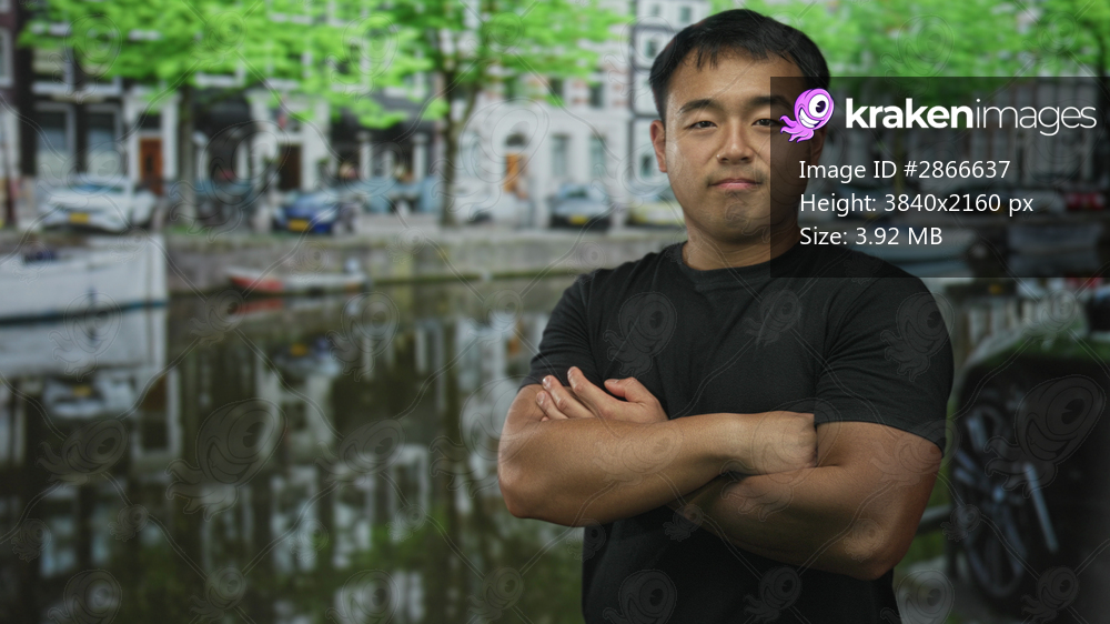 Young man with arms crossed by canal in urban street outdoors near boats and parked cars along tree lined embankment; denial.