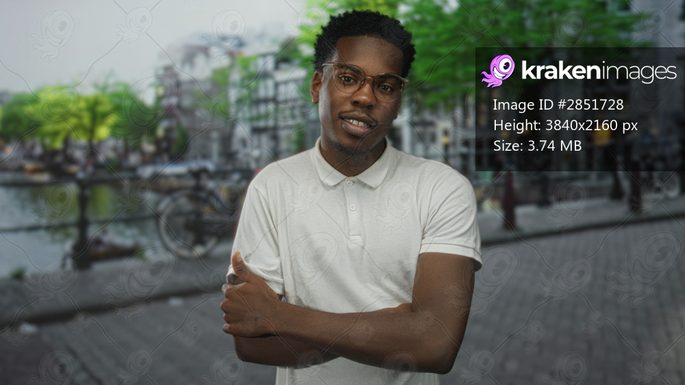 Young man with arms crossed by canal on urban street; confidence contemplation resilience determination.