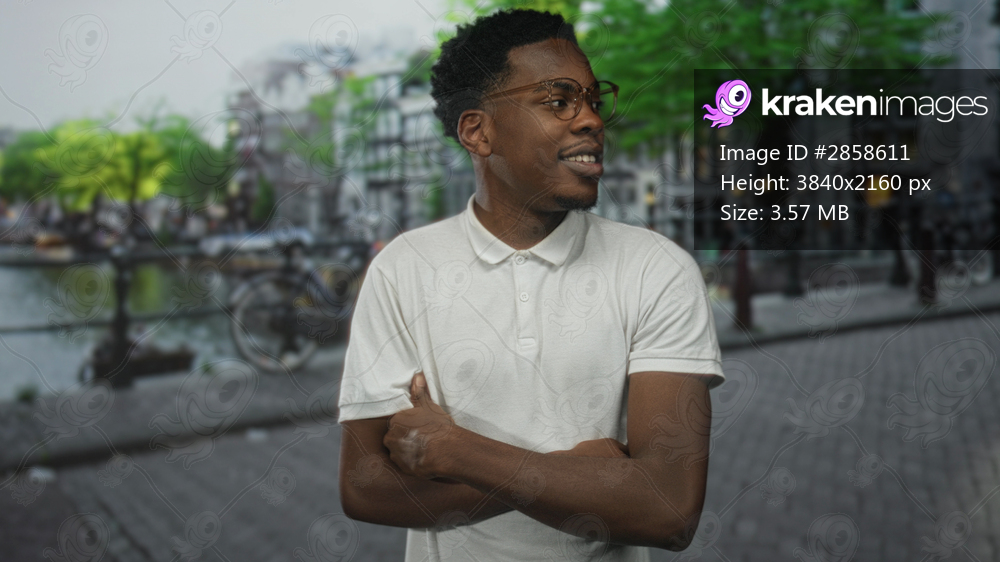 Young man with arms crossed by canal on urban street; confidence contemplation resilience determination.