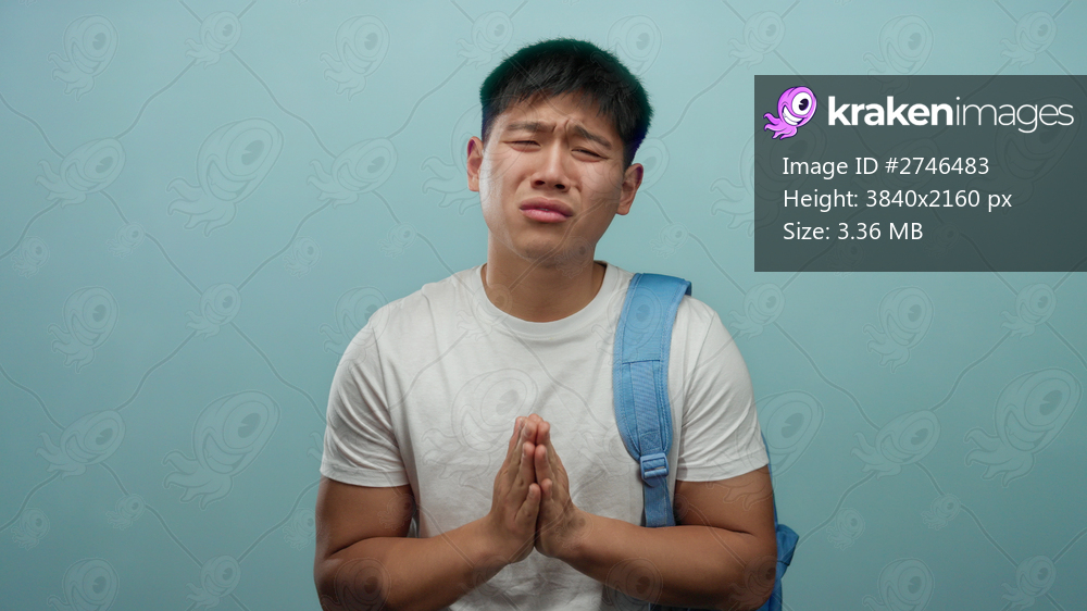 Young man with asian descent praying with hopeful expression against isolated blue background, showing emotion and sincerity.