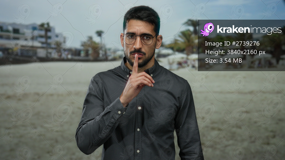 Young man at a beach making a shushing gesture with a calm seaside background, wearing glasses and a dark shirt on a sunny day.