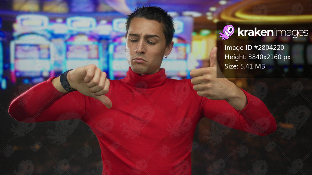 Young man at a casino giving mixed thumbs up and down gestures, surrounded by colorful slot machines in a lively indoor setting, showcasing decision and luck. - Kraken Images
