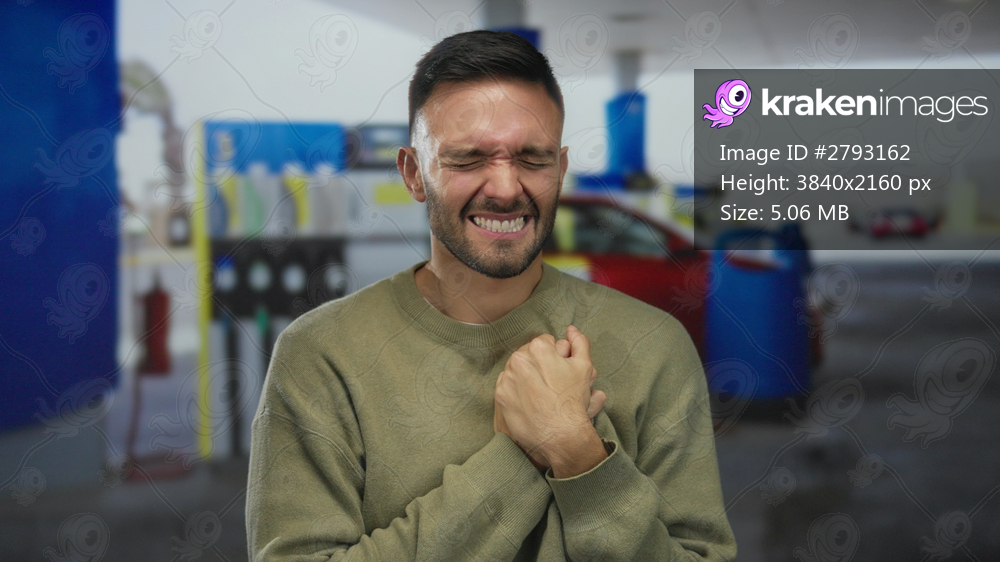 Young man at a gas station outdoors clutches his chest in pain, expressing discomfort, with blurred background of pumps and a red car, highlighting an emotional moment. - Kraken Images
