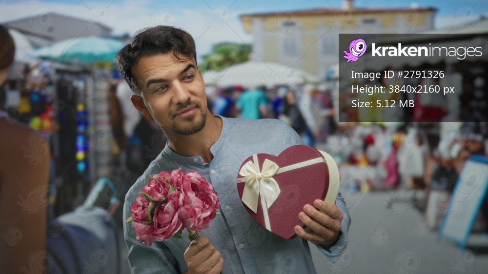 Young man at outdoor market holding flowers and heart-shaped gift box, surrounded by bustling street vendors and shoppers, showcasing vibrant market atmosphere. - Kraken Images