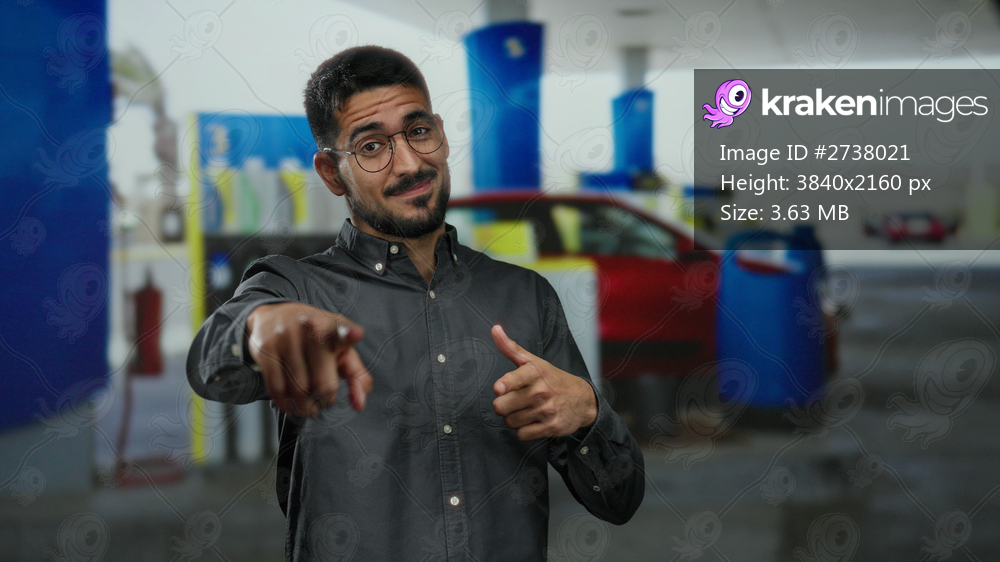 Young man at outdoor petrol station with red car confidently gestures in casual attire, highlighting modern lifestyle and automotive service setting.