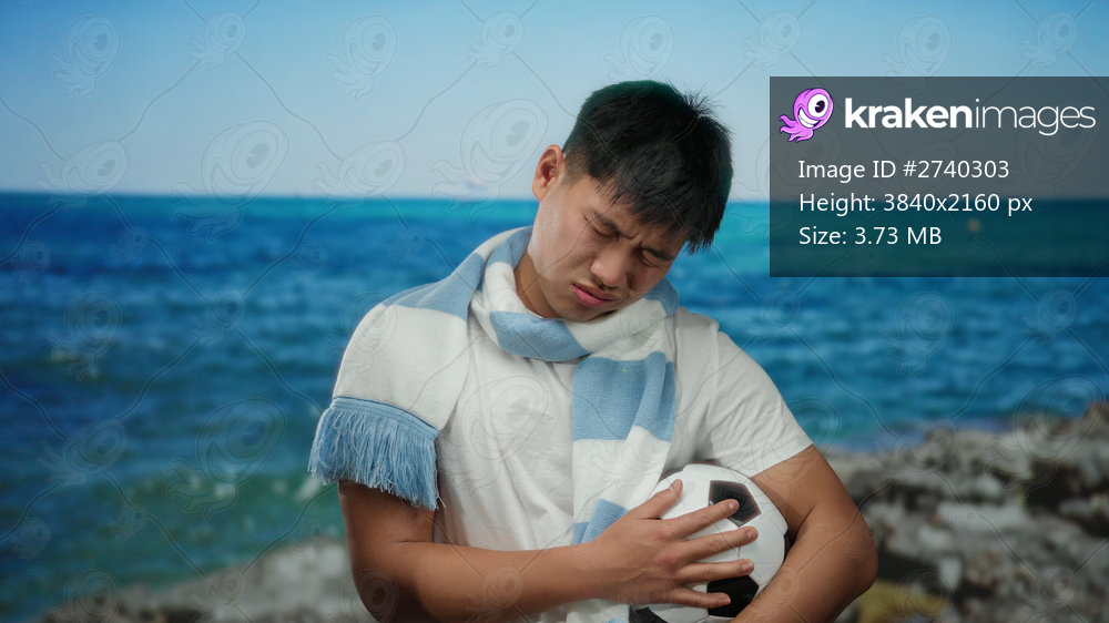 Young man at seaside holding soccer ball with scarf, enjoying the beach scenery under clear blue sky, embodying leisure and sport.