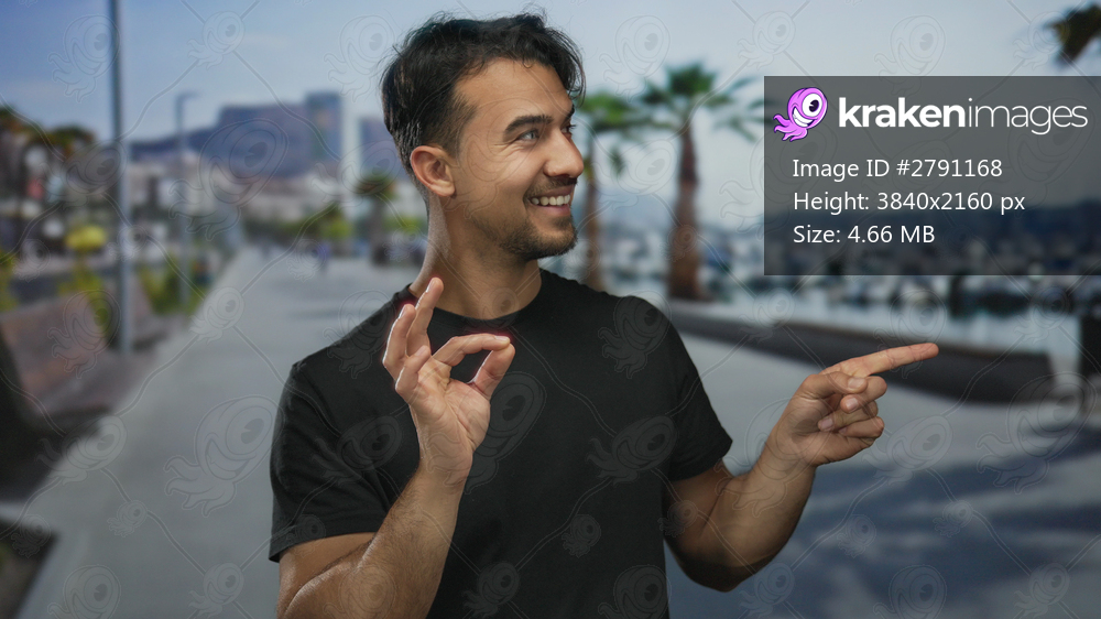 Young man at seaside port making ok gesture with a cheerful smile, pointing into the distance, framed by palm trees and boats under a clear sky.